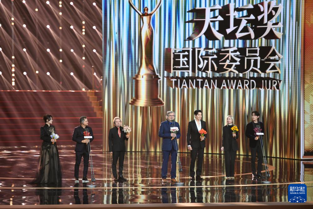 4月18日,第十四届“天坛奖”国际评奖委员会主席埃米尔·库斯图里卡(中)和评委大卫·怀特(左三)、费翔(右三)、杰茜卡·豪丝娜(右二)、卡洛斯·沙尔丹哈(左二)、马丽(左一)、朱一龙亮相开幕式。新华社记者 陈钟昊 摄