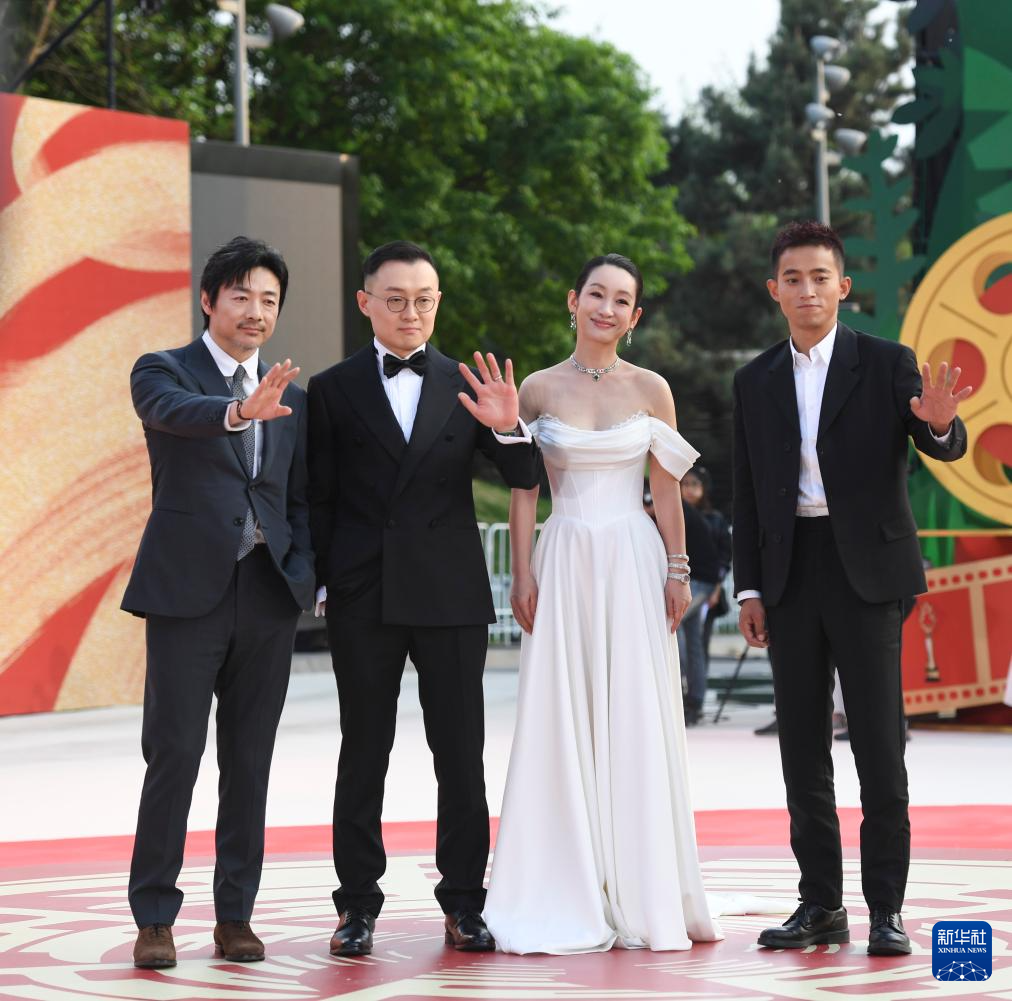 4月18日,电影《老枪》导演高朋(左二)和演员祖峰(左一)、秦海璐(右二)、周政杰亮相开幕红毯。新华社记者 陈钟昊 摄pagebreak