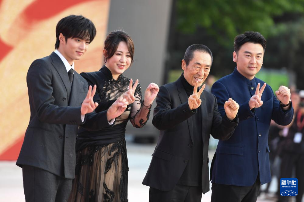 4月18日,电影《第二十条》导演张艺谋(右二)和演员马丽(左二)、雷佳音(右一)、刘耀文亮相开幕红毯。新华社记者 陈钟昊 摄pagebreak
