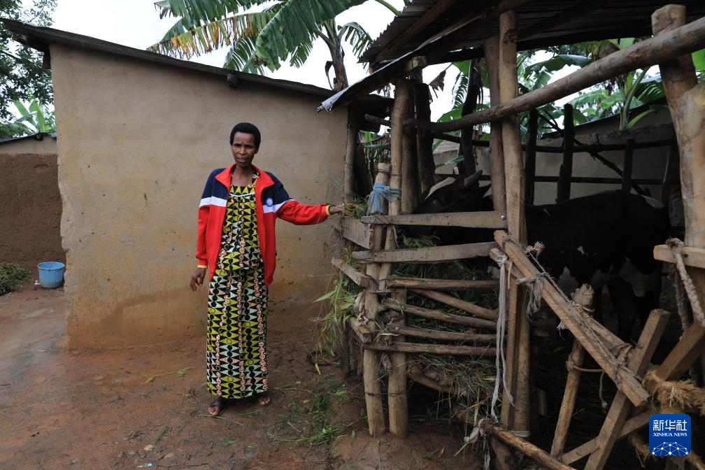 4月7日,在卢旺达东方省姆比约团结和解村,幸存者杰奎琳在家中喂牛。新华社记者 董江辉 摄