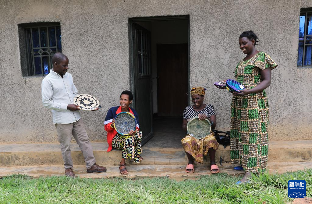4月7日,在卢旺达东方省姆比约团结和解村,弗雷德里克(左一)与杰奎琳(左二)及村中妇女展示编织工艺品。新华社记者 董江辉 摄