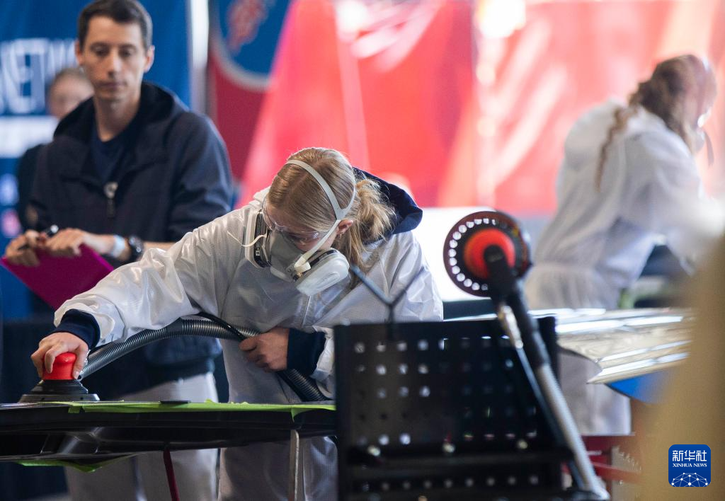 5月6日,在加拿大多伦多举行的安大略省学生技能大赛中,一名学生参加汽车漆喷涂比赛。