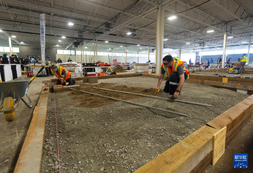 5月6日,在加拿大多伦多举行的安大略省学生技能大赛中,一名学生参加石膏板隔墙搭建与墙面抹灰比赛。
