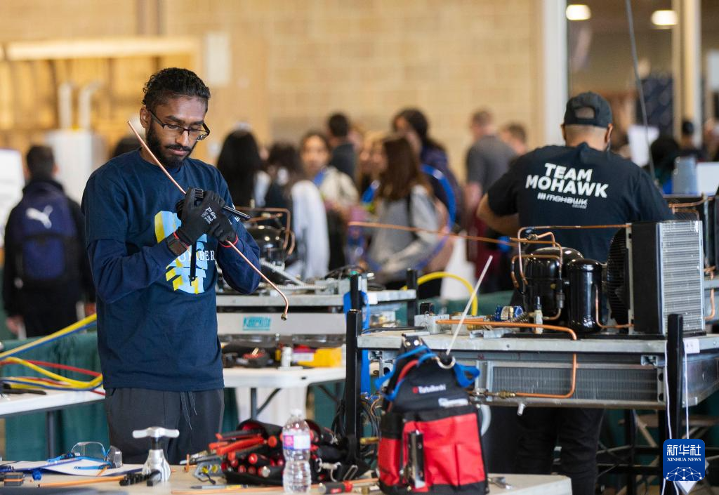 5月6日,在加拿大多伦多举行的安大略省学生技能大赛中,一名学生参加制冷系统比赛。