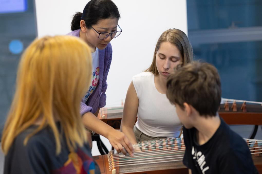 4月29日,在塞尔维亚贝尔格莱德中国文化中心,古筝指导老师王宣(后左)在教学。新华社记者李京摄