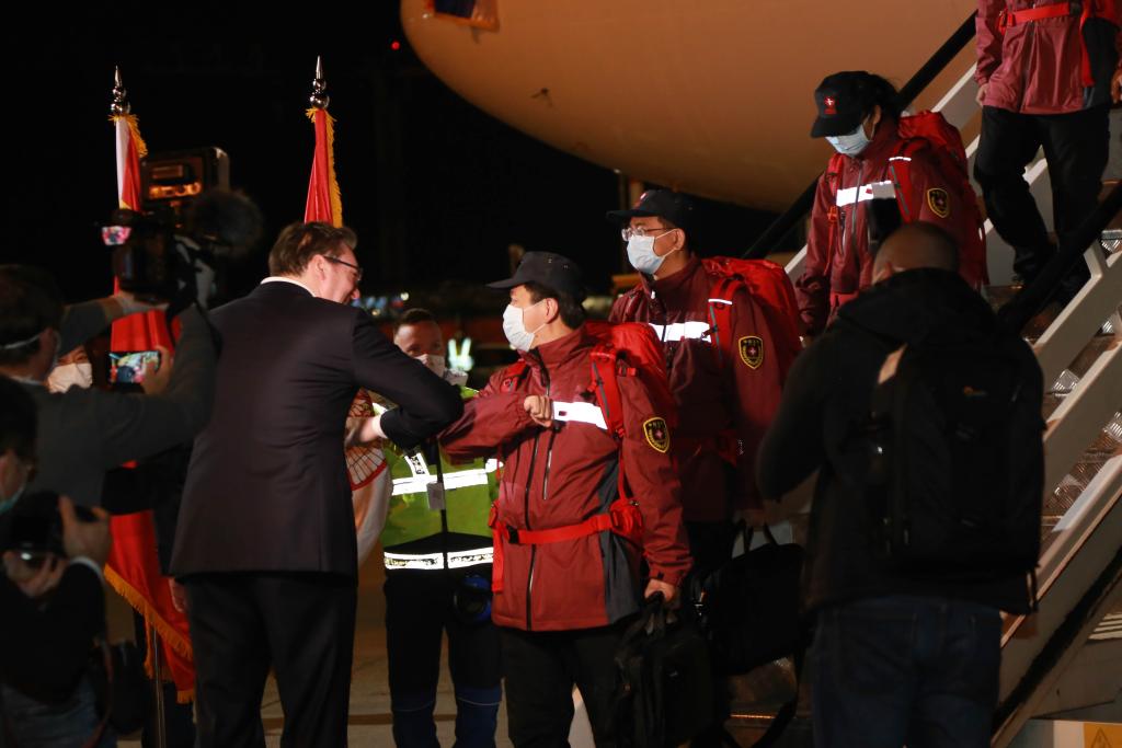 这是2020年3月21日,在塞尔维亚首都贝尔格莱德,前来迎接的塞尔维亚总统武契奇(左)与中国援助塞尔维亚抗疫医疗专家组成员“碰肘”致意。新华社记者石中玉摄
