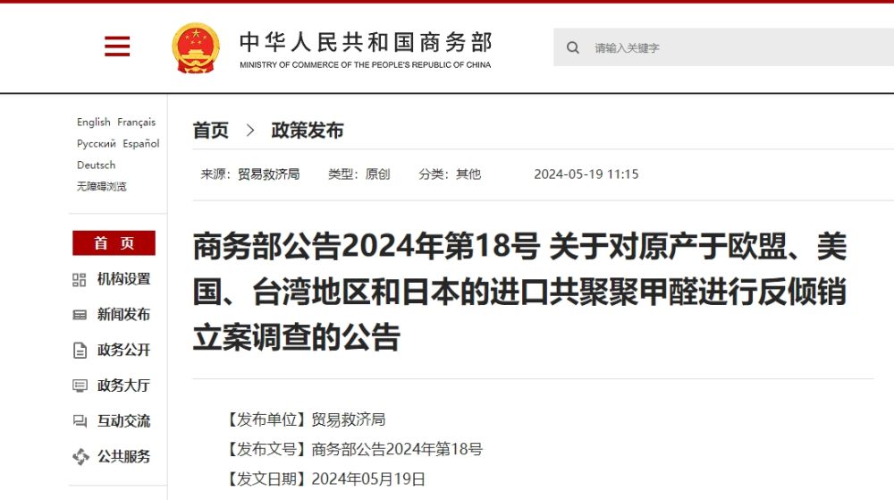 原标题:商务部公告2024年第18号 关于对原产于欧盟、美国、台湾地区和日本的进口共聚聚甲醛进行反倾销立案调查的公告