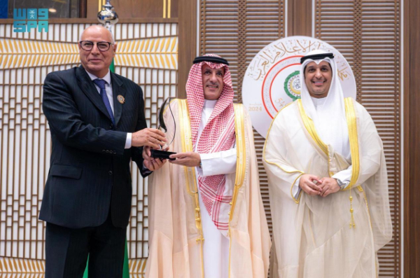 图为沙特通讯社社长(中)领取2024年阿拉伯媒体卓越奖。沙通社供图/新华社发