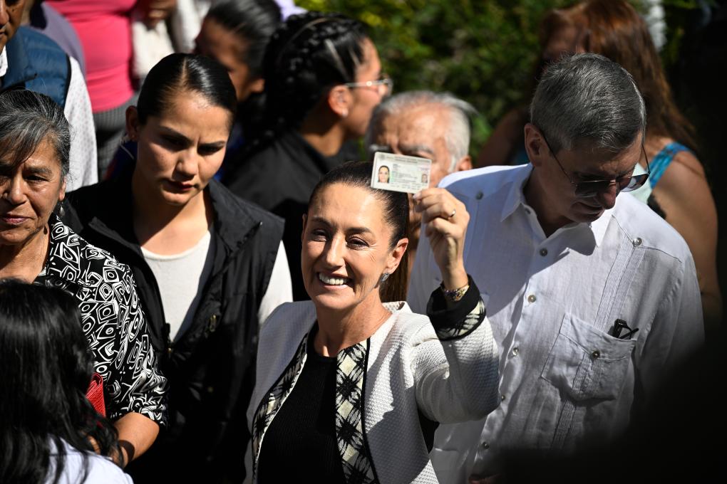6月2日,在墨西哥首都墨西哥城一处投票站,辛鲍姆展示选民证。新华社记者李木子摄