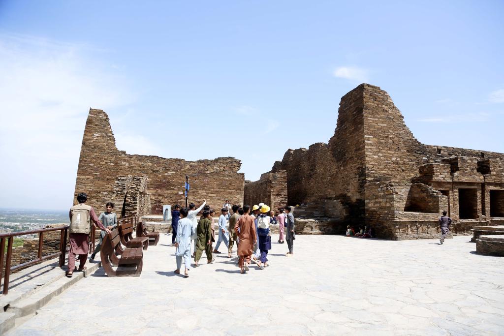5月5日,当地儿童在巴基斯坦西北部马尔丹市的塔赫特巴希佛寺遗址参观。2023年,中国志愿者同巴基斯坦开伯尔-普什图省考古与博物馆管理局联合发起“犍陀罗守护人”项目,为当地儿童开设遗产保护教育课是项目内容之一。新华社发(艾哈迈德·卡迈勒摄)