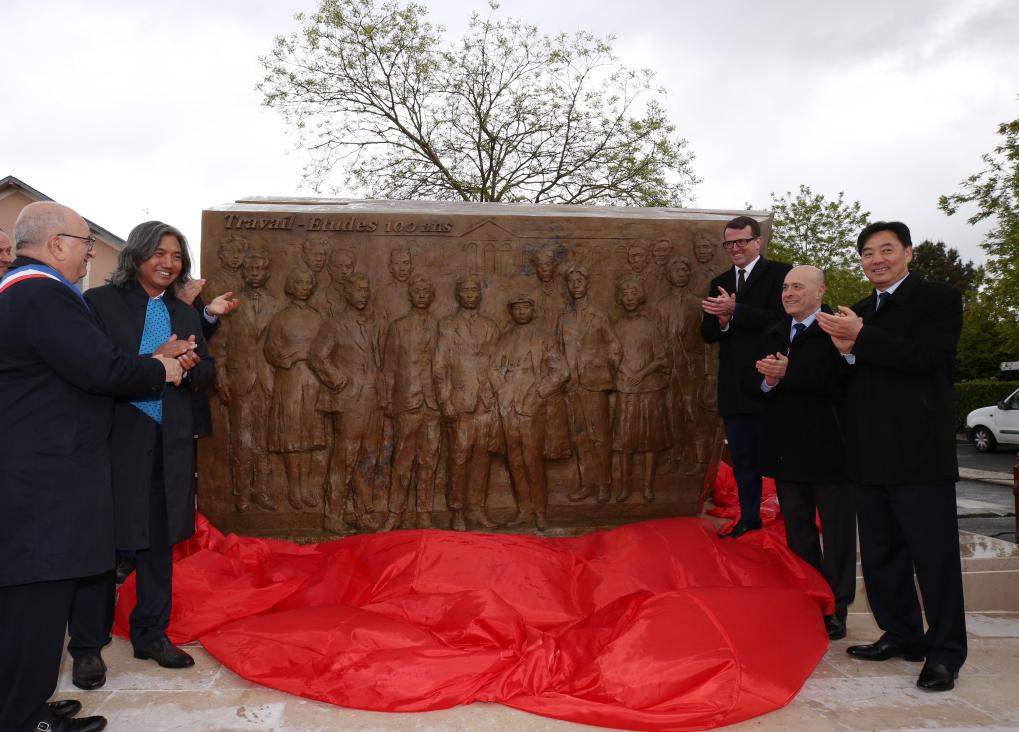 2019年5月4日,在距法国巴黎100多公里的小城蒙达尔纪,嘉宾在火车站前的邓小平广场出席《百年丰碑》大型雕塑安放仪式。左二为中国美术馆馆长吴为山。新华社记者高静摄