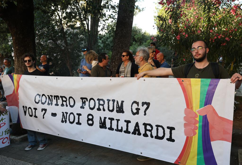 七国集团峰会6月13日至15日在意大利普利亚大区法萨诺举行。图为6月14日,在法萨诺镇,人们在抗议活动中。新华社记者李京摄