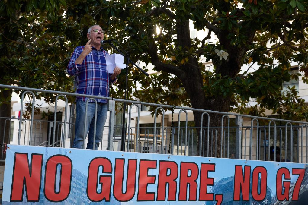 6月13日,在距七国集团峰会会场60公里的意大利布林迪西市,一名抗议者发表演说抗议七国集团峰会。新华社记者孟鼎博摄