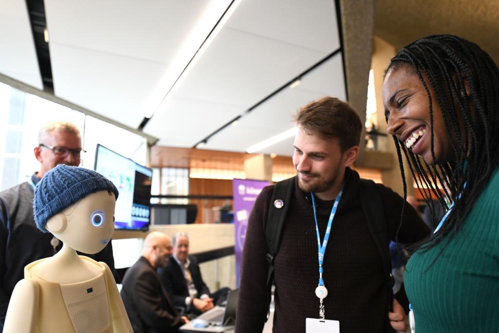 5月30日,在瑞士日内瓦举行的2024年“人工智能造福人类全球峰会” 上,参会者和一个用于社会关怀的机器人互动。新华社记者连漪摄