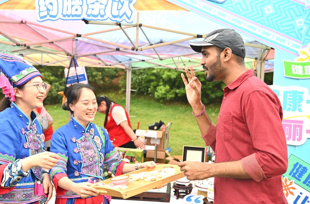 2024年4月11日,一名外国游客在“广西三月三·八桂嘉年华”活动广西南宁市青秀山主会场品尝美食后做出“OK”手势。新华社记者周华摄