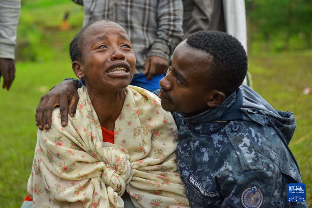 7月28日,在埃塞俄比亚盖泽戈法地区,一名警察安慰在山体滑坡中失去亲人的当地村民。