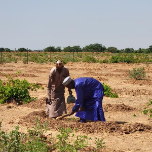 2023年6月5日,在尼日利亚卡诺州的中国科学院新疆生态与地理研究所与尼日利亚非洲荒漠化控制倡议组织合作开展的治沙项目所在地,维护人员种植树苗。新华社记者 郭骏 摄