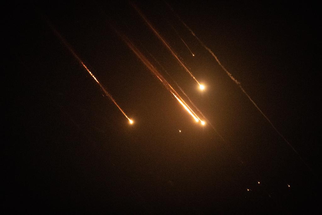 10月1日,以军防空系统拦截的发射物从耶路撒冷上空飞过。新华社记者 陈君清 摄