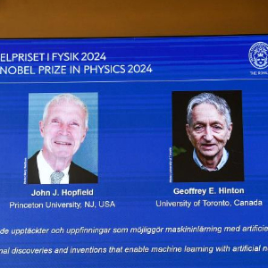10月8日,在瑞典斯德哥尔摩举行的2024年诺贝尔物理学奖公布现场,屏幕显示奖项得主美国普林斯顿大学的约翰·霍普菲尔德和加拿大多伦多大学的杰弗里·欣顿。新华社记者 彭子洋 摄