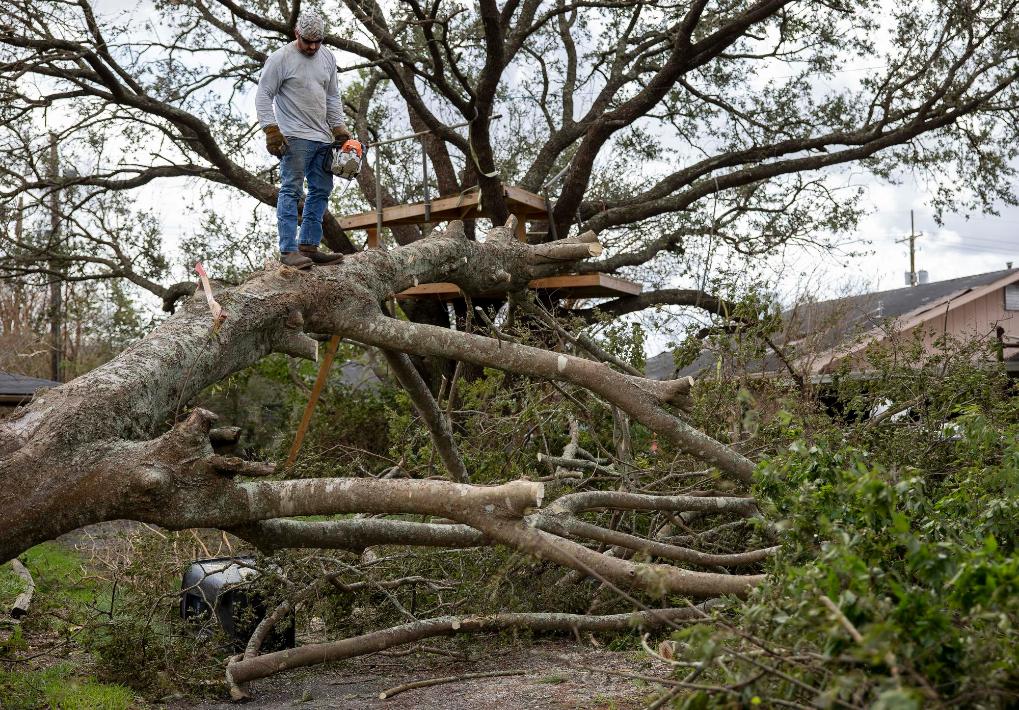 2021年8月30日,在美国路易斯安那州霍马,一名男子站在被飓风吹倒的大树上。新华社发(尼克·瓦格纳 摄)