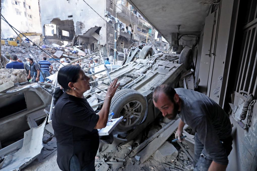 10月11日,在黎巴嫩首都贝鲁特,人们在以色列袭击现场清理废墟。新华社发(比拉尔·贾维希摄)