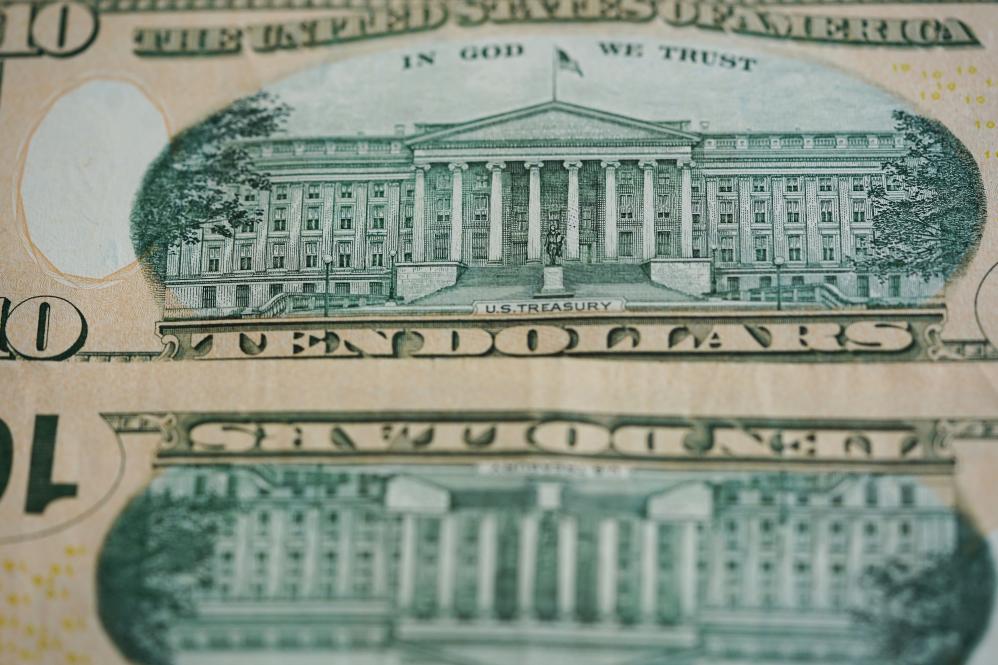 这是2020年4月29日在美国首都华盛顿拍摄的美元纸币上的美国财政部大楼。新华社记者刘杰摄