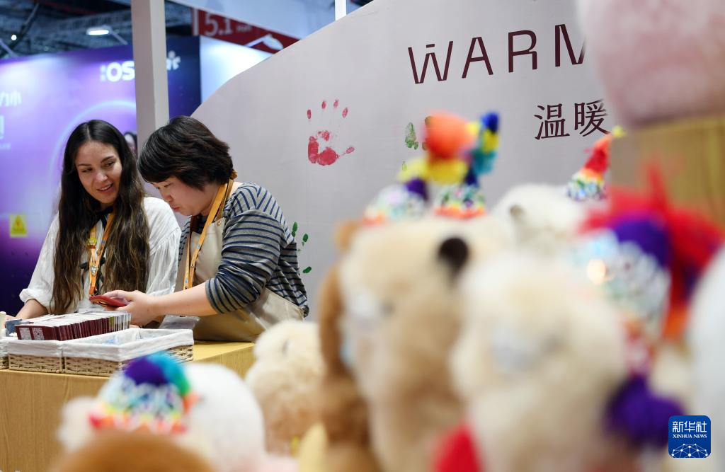 11月5日,“温暖驼”创始人马玉霞(右)与秘鲁合伙人在上海的第七届进博会秘鲁“温暖驼”展台忙碌。