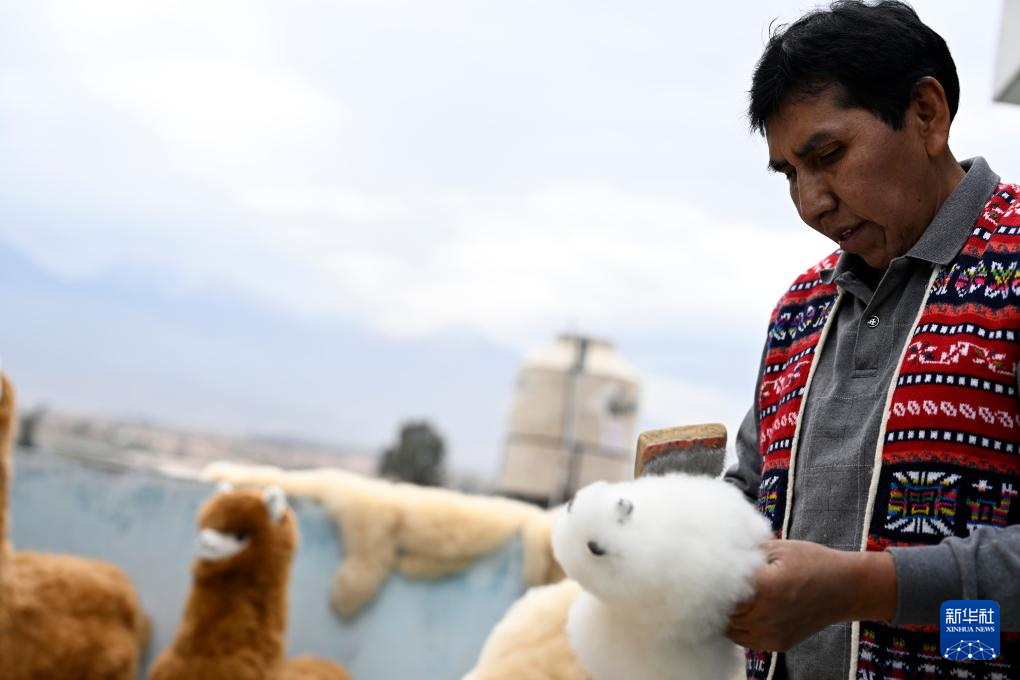 6月20日,在秘鲁阿雷基帕,羊驼毛制品手工艺人奥斯瓦尔多·马马尼检查羊驼玩偶。