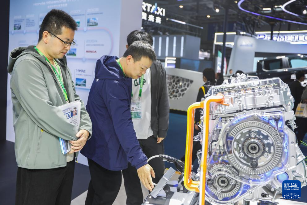 11月7日,观众在第七届进博会汽车展区了解本田PHEV强电智混系统模型。