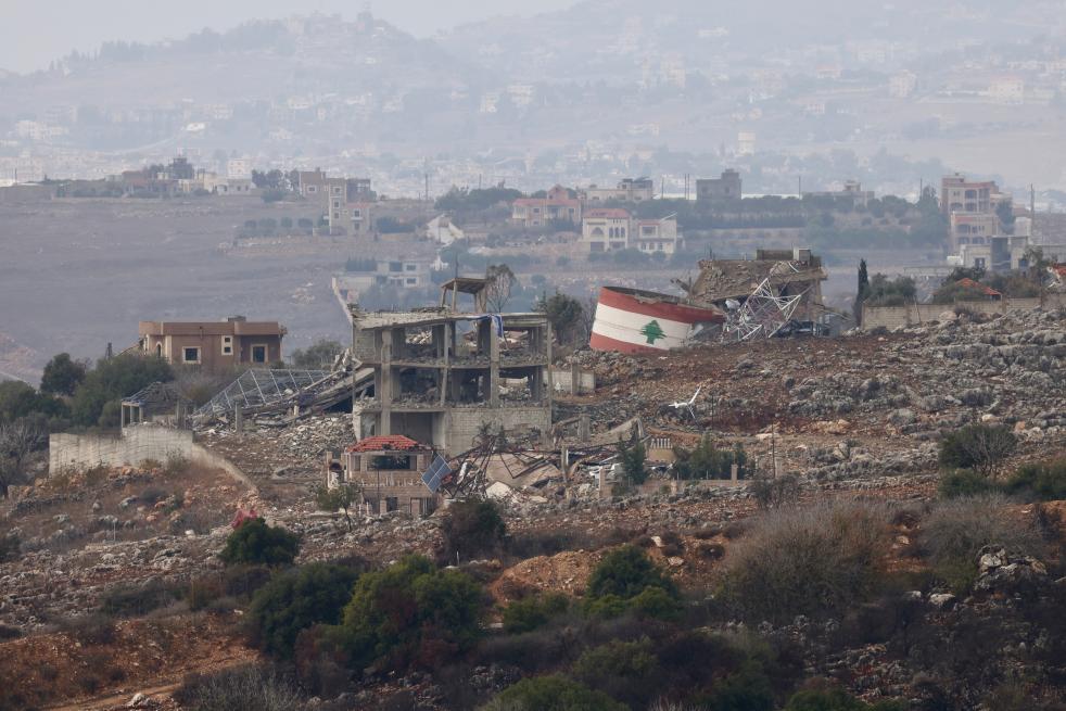 这是11月27日从黎巴嫩和以色列边境地区以色列一侧拍摄的黎南部损毁建筑。新华社发(贾马尔·阿瓦德摄)