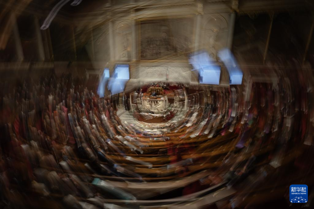 这是法国巴黎的国民议会就对政府不信任动议投票表决前的辩论现场(12月4日摄)。新华社发(奥雷利安·莫里萨尔摄)