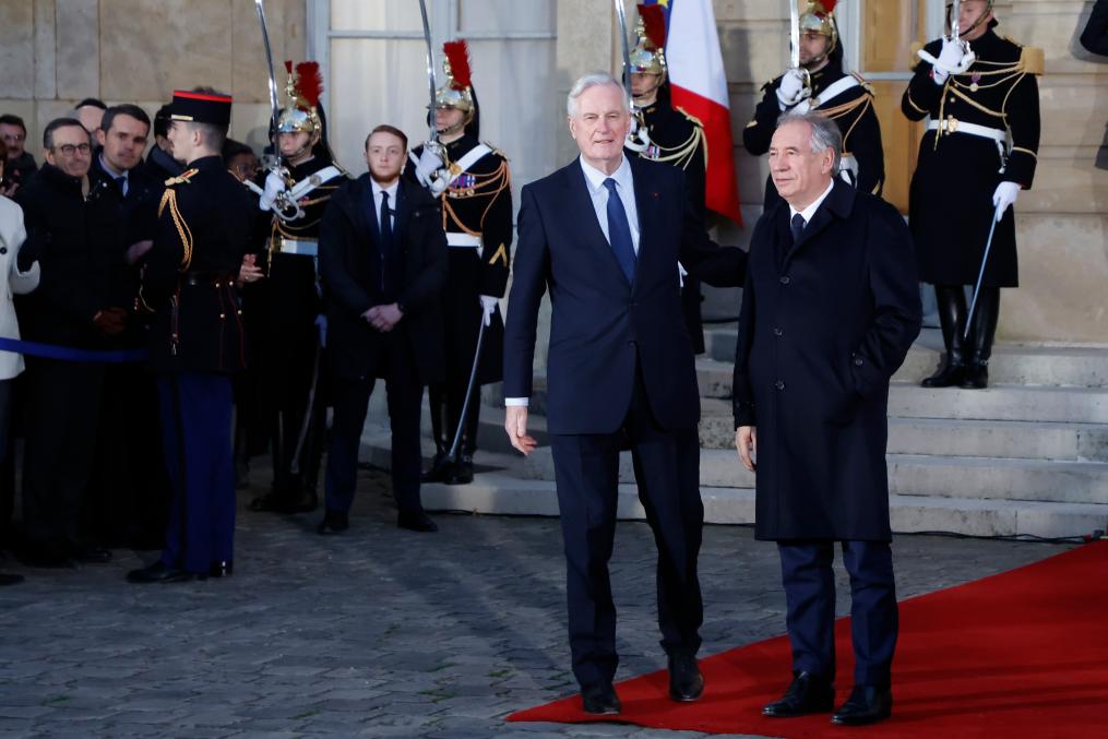 12月13日,在法国巴黎,巴尼耶(前左)与弗朗索瓦·贝鲁(前右)出席权力交接仪式。新华社发(亨利·施瓦茨摄)