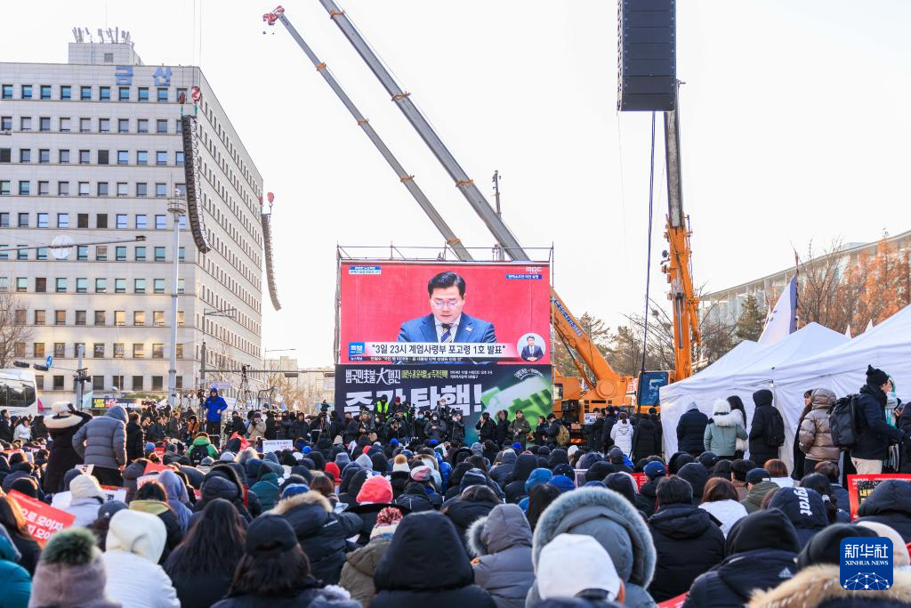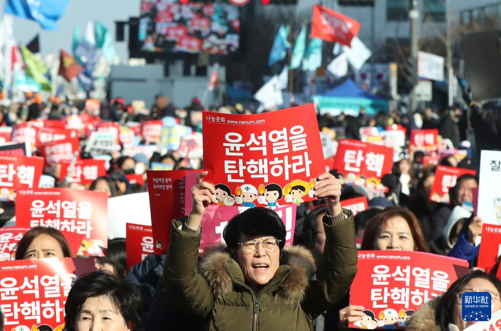 12月14日,在韩国首都首尔,人们在国会外参加要求弹劾总统尹锡悦的集会。新华社记者 姚琪琳 摄