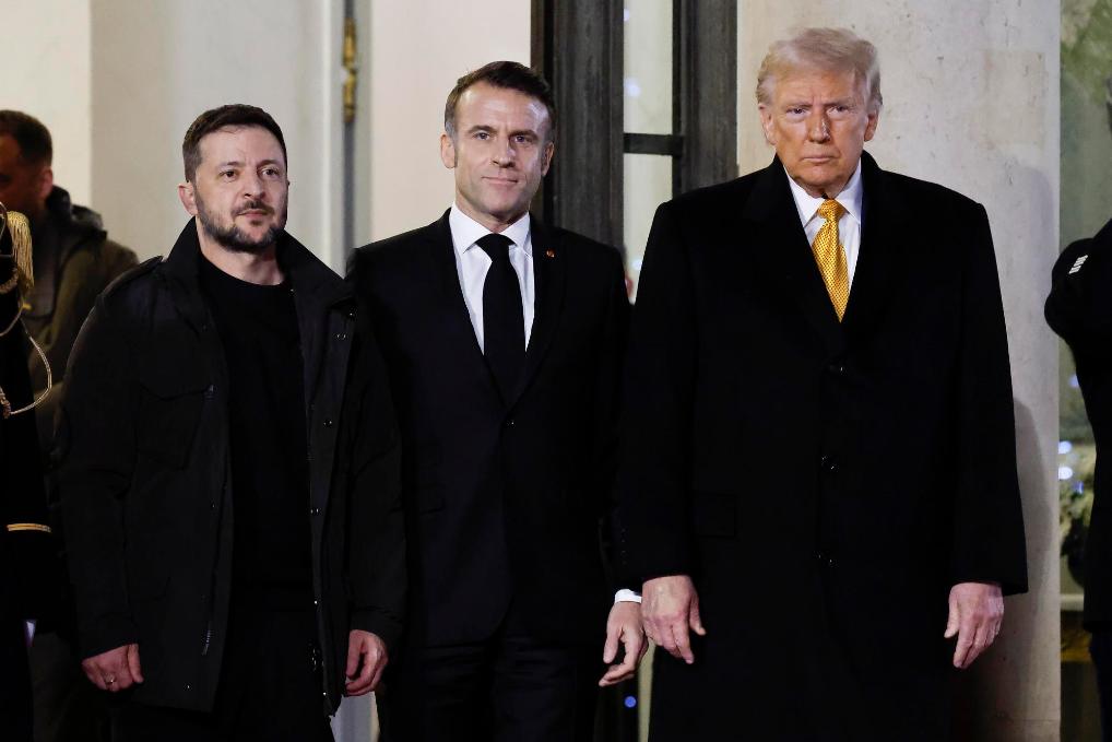 12月7日,法国总统马克龙(中)与美国当选总统特朗普(右)和乌克兰总统泽连斯基会晤后走出爱丽舍宫。新华社发(亨利·施瓦茨摄)