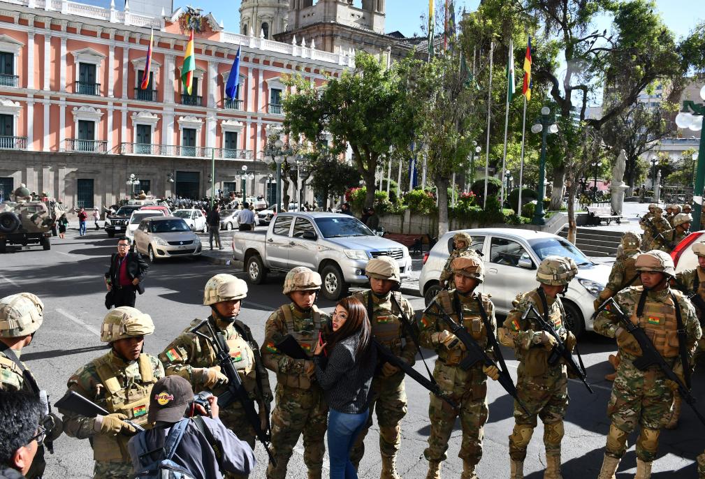 6月26日,在玻利维亚拉巴斯,士兵聚集在总统府附近的街道上。新华社发(罗伯托·阿兰达摄)
