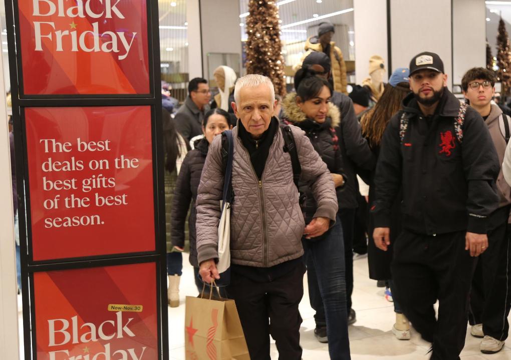 11月29日,在美国纽约曼哈顿岛的一家商场内,人们经过“黑色星期五”促销广告牌。新华社记者刘亚南摄