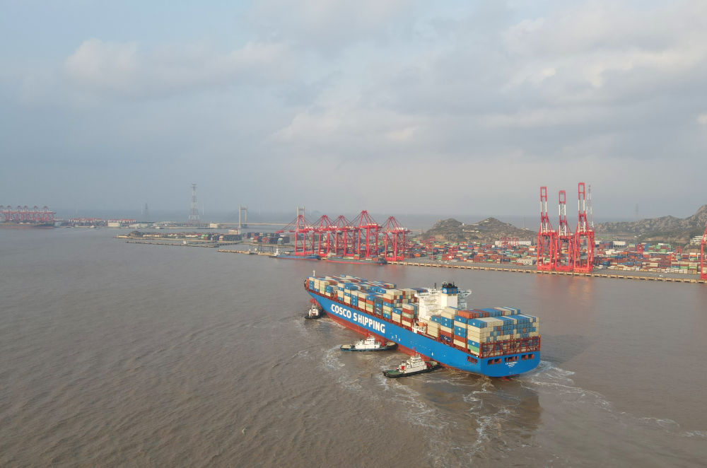 “新上海”轮抵达洋山港,这是自秘鲁钱凯港开港后首个“钱凯—上海”正式航次(2024年12月18日摄,无人机照片)。新华社记者 方喆 摄