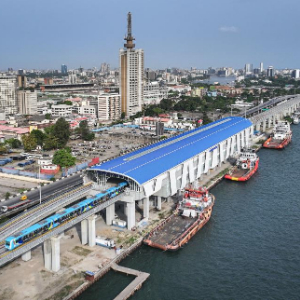 2024年3月2日,在尼日利亚拉各斯,一列轻轨蓝线列车驶入码头站(无人机照片)。新华社记者韩旭摄