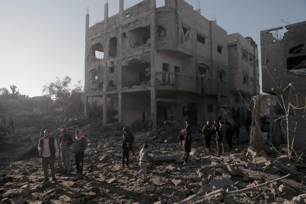 1月2日,在加沙地带南部城市汗尤尼斯,人们查看被以军炸毁的建筑。新华社发(里泽克·阿卜杜勒贾瓦德摄)