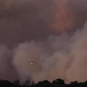 1月11日,一架消防直升机在美国加利福尼亚州洛杉矶曼德维尔峡谷的山丘上空飞行。新华社发(邱晨摄)