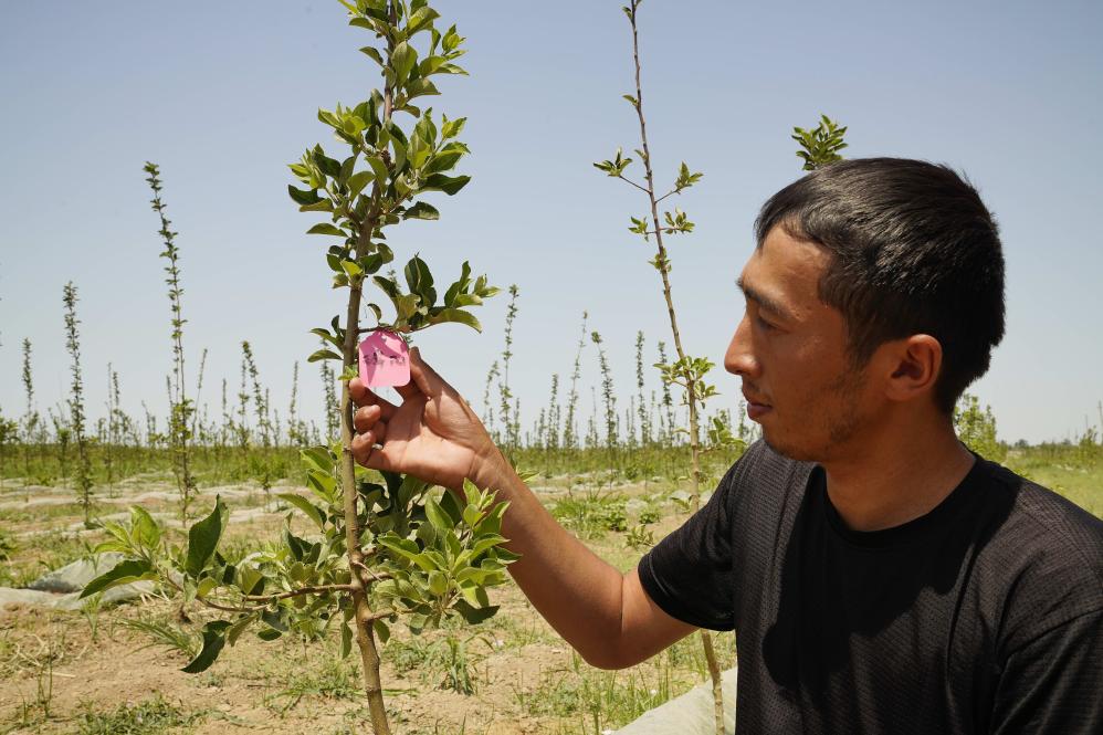 上合组织农业基地中乌现代农业科技示范园位于乌兹别克斯坦锡尔河州,2024年春天,园区从陕西省铜川市引进的6000株优质青砧苹果种苗成功定植。记者日前到园区采访时遇到了果农图尔苏诺夫,他负责照看这些种苗,观察记录生长情况。“受品种和技术限制,我们以前的苹果产量和质量都不高,受气候影响较大。与此相比,来自中国的种苗具有更高的质量。”