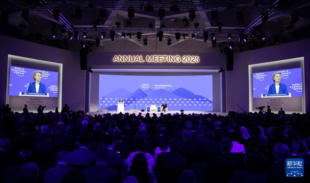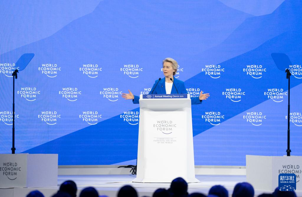 1月21日,在瑞士达沃斯,欧盟委员会主席冯德莱恩在世界经济论坛2025年年会上讲话。新华社记者 彭子洋 摄