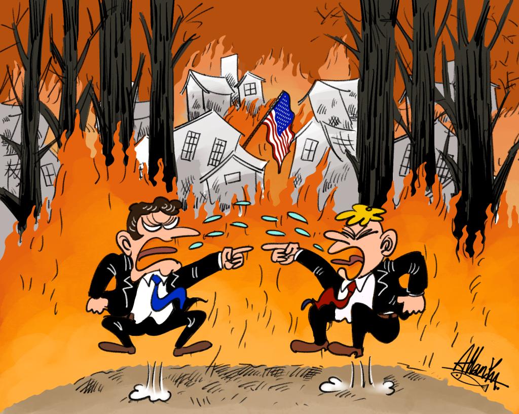 就在灾区民众流离失所、前线消防员穿梭火场之时,美国民主与共和两党政客就山火追责“点燃”骂战。德国《法兰克福汇报》网站文章评论说,美国正因加州山火陷入“政治火海”。