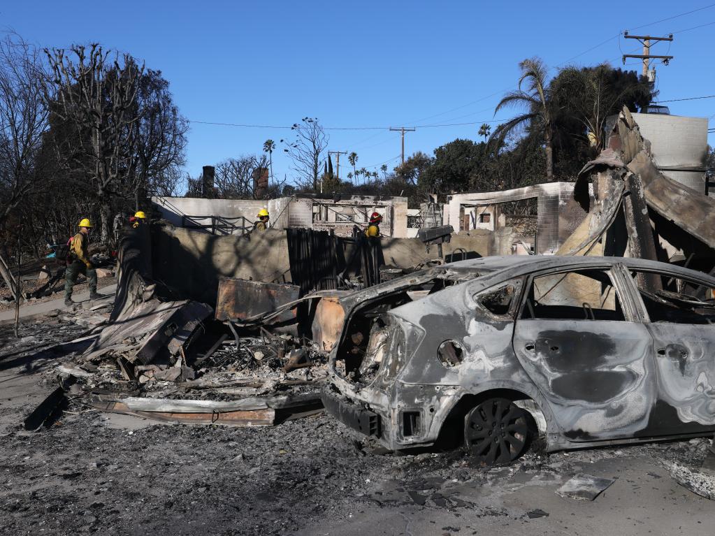 1月15日,在美国加利福尼亚州洛杉矶阿尔塔迪纳,消防员逐门逐户检查山火余烬。新华社发(邱晨摄)