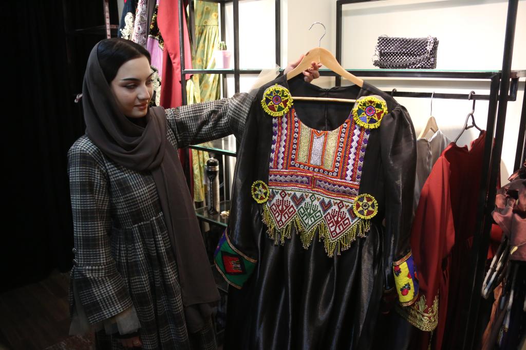 2月16日,阿富汗喀布尔一家服装店的销售员芭哈拉·萨利米展示店内售卖的衣物。新华社发(塞夫拉赫曼·萨菲摄)
