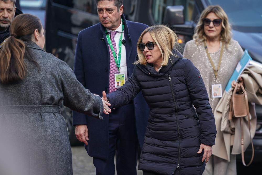 2025年2月3日,在比利时首都布鲁塞尔,意大利总理梅洛尼抵达欧盟峰会会场。新华社记者彭子洋摄