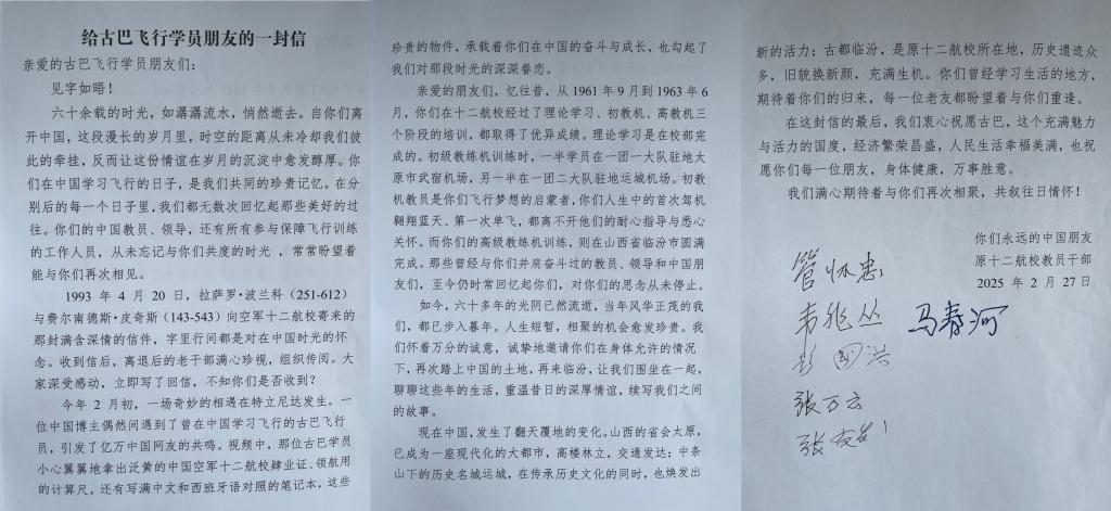 近日,古巴退役飞行员的故事又有后续了。几位耄耋之年的中国教员,共同写下《给古巴飞行学员朋友的一封信》,忆往昔岁月,并向古巴朋友发出邀请,希望他们能够再次踏上中国的土地,再来临汾,故地重游,再叙情缘。