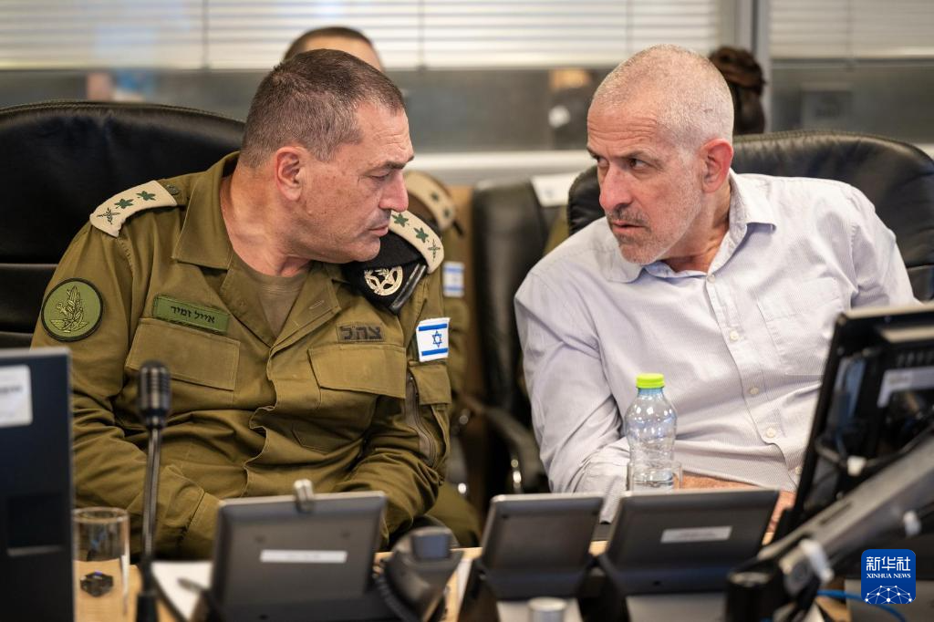 3月18日,以色列国防军总参谋长扎米尔(左)和以国家安全总局(辛贝特)局长巴尔在以色列空军地下作战中心指挥对加沙地带的空袭。新华社发(以色列国防军供图)