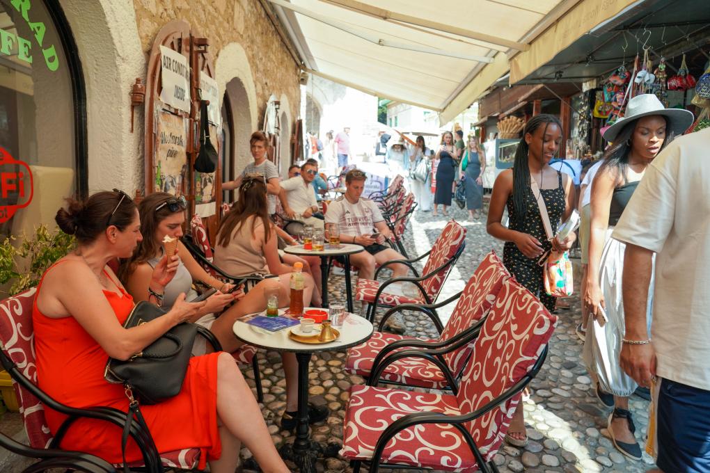 2024年7月24日,游客在波黑莫斯塔尔古城一家店铺的遮阳棚下品尝冷饮。新华社发(贾斯明·布鲁图斯摄)