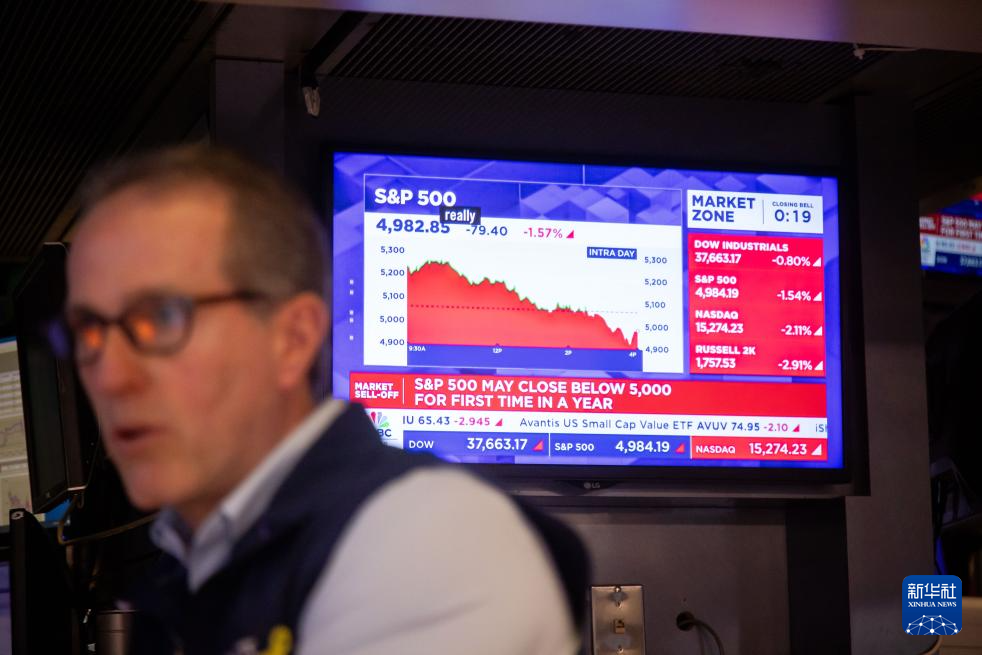 截至当天收盘,道琼斯工业平均指数比前一交易日下跌320.01点,收于37645.59点,跌幅为0.84%;标准普尔500种股票指数下跌79.48点,收于4982.77点,跌幅为1.57%;纳斯达克综合指数下跌335.35点,收于15267.91点,跌幅为2.15%。
